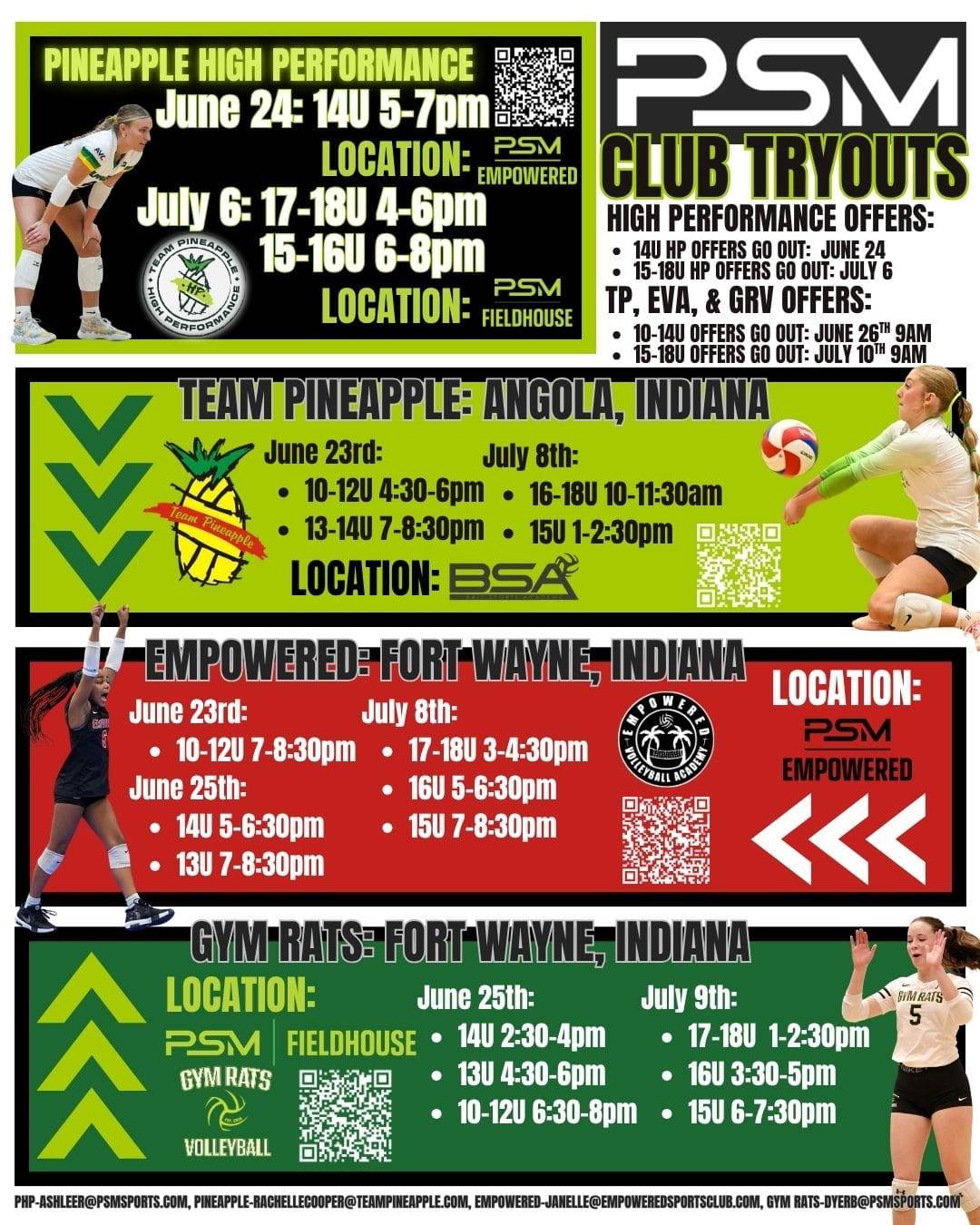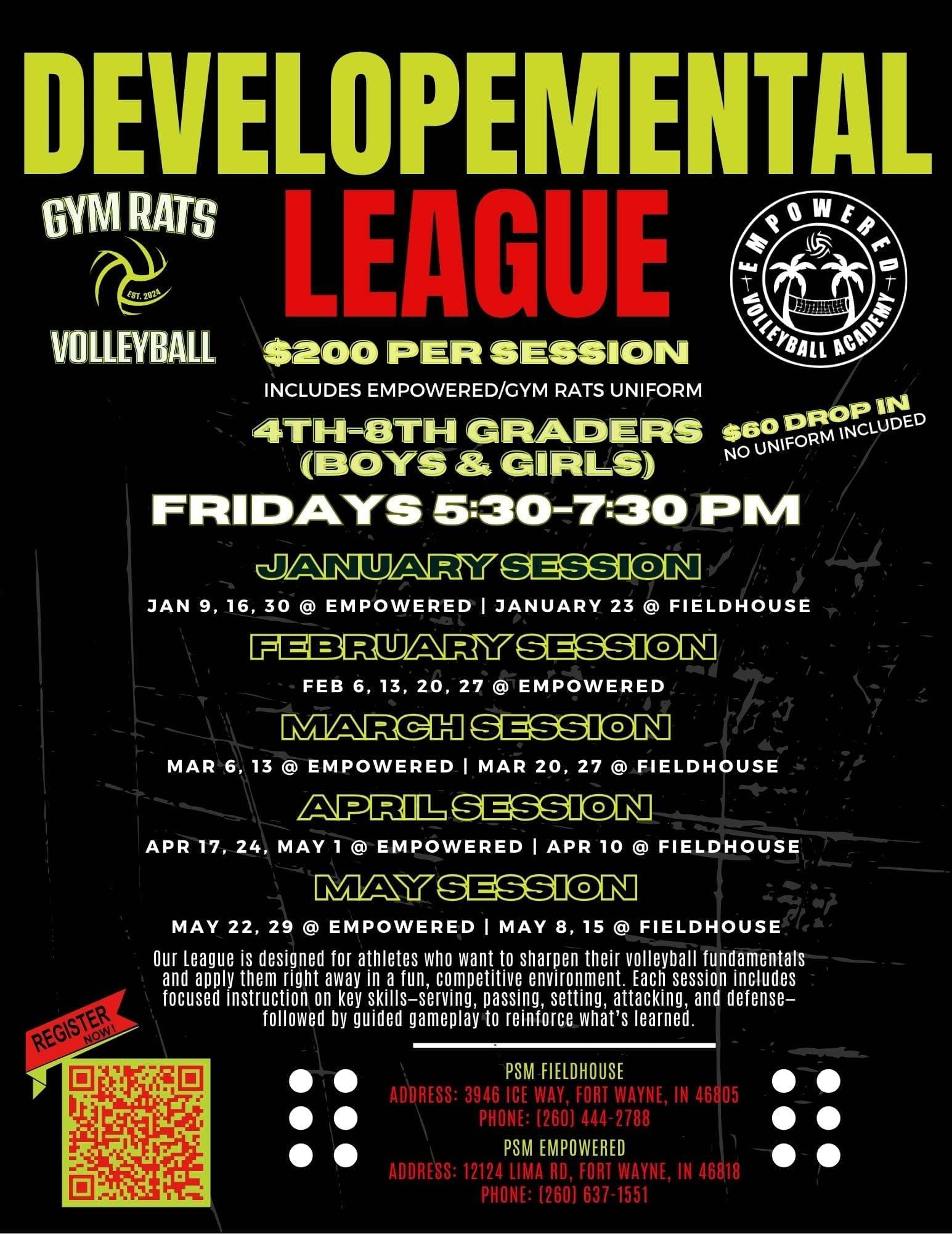 Gym Rats Volleyball will train and play in the largest volleyball training facility in the area that will offer convenient practice and game times in a prime location in town, the PSM Fieldhouse. The Fieldhouse will be a one-stop training facility for Gym Rats Volleyball Athletes allowing for Volleyball practice, Performance Training, Sports Nutrition guidance, and Peak Performance Training in partnership with Parkview Sports Medicine, Empowered Volleyball Club, and Gym Rats Basketball all in the same sports facility.
